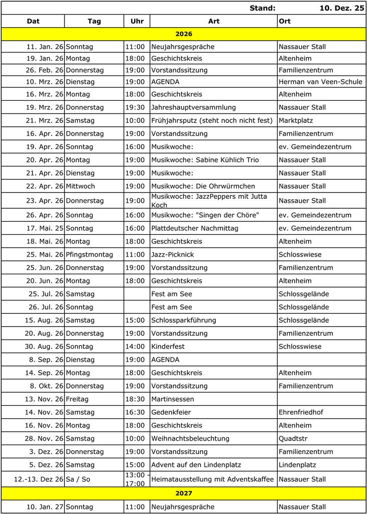 Liebe Mitglieder, sehr geehrte Damen und Herren, zum Jahresende möchten wir uns bei Ihnen für Ihre Treue und Verbundenheit zum Heimat- und Verkehrsverein Wickrath e. V. bedanken, eine geruhsame Advents- und Wihnachtszeit, viel Glück und Gesundheit in 2026 wünschen. In diesem Sinne möchten wir Sie nochmals herzlichst zu unserer letzten Veranstaltung in diesem Jahr und zur ersten Veranstaltung im neuen Jahr einladen. Hier zum HuVV-Kalender 2026 Hier zum Wickrather Veranstaltungskalender 2026 |