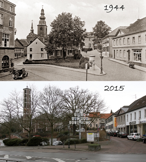 Wickrath-Markt- 1944-2015: Oben: Diese Postkarte zeigt die Wickrather Ortsmitte vor dem Bombenangriff mit der historischen Kirche St. Antonius und der Kirchstraße (li.). [Privatsammlung Ellen Dath] Unten: Die Wickrather Ortsmitte heute.