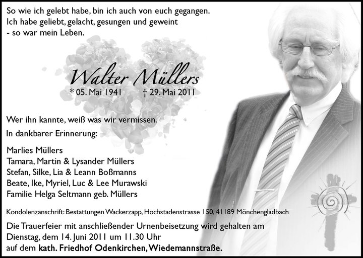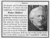 | 29. Mai 2011 | Plötzlich und unerwartet verliert der Verein sein langjähriges Vorstandsmitglied Walter Müllers. Walter Müllers hat mit seiner unglaubliche Vitalität etliche Dinge im Verein bestens organisiert und stand bei vielen Aufgaben immer mit Rat und Tat zur Seite. U. a. wurde von ihm die Gedenkfeier zum Volkstrauertag vorbereitet und er hat die Weihnachtsgespräche im Nassauer Stall mit zum Erfolg werden lassen. Wir werden Walter vermissen. |