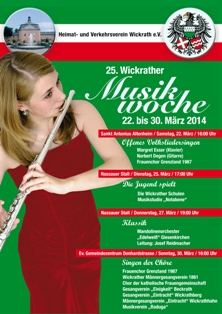 | 27. März | 25. Wickrtaher Musikwoche: "Klassik". Das Mandolinenorchester „Edelweiß“ aus Giesenkirchen spielte klassische Kompositionen und hervorragend umgesetzte Filmmusiken der neueren Zeit. Die zahlreichen Zuhörer dankten mit stehenden Ovationen und lang anhaltendem Applaus. |