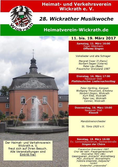 Vom Volkslied zur Klassik Die Wickrather Musikwoche steht vor der Tür! In diesem Jahr hat der Heimat- und Verkehrsverein Wickrath für die nun schon im 28. Jahr stattfindende Musikwoche ein abwechslungsreiches Programm für fast jeden Musikgeschmack zusammengestellt. Der Besuch der Musikwoche gehört für viele Wickrather schon zur liebgewonnenen Tradition!