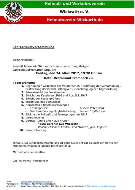 Liebe Mitglieder, hiermit möchten wir Sie zu unserer diesjährigen Jahreshauptversammlung, am Freitag, den 24. März 2017, 19:30 Uhr im Hotel-Restaurant Frambach einladen