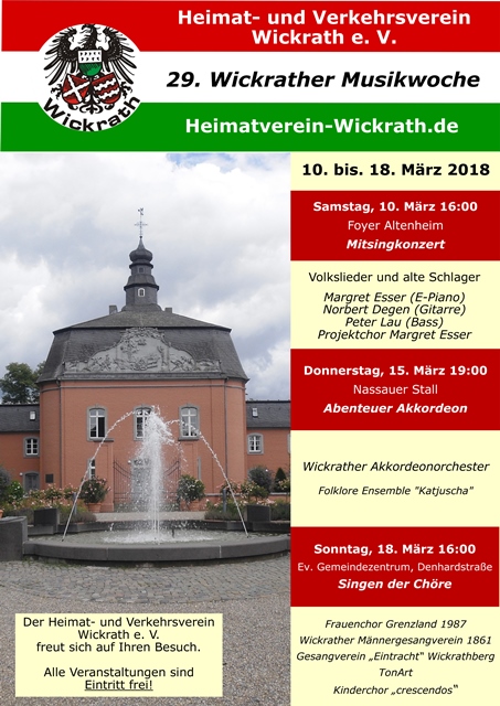 Samstag, 10. März 16:00 Uhr / Foyer Altenheim Sankt Antonius - Mitsingkonzert- .................................................................................................... Donnerstag, 15. März 19:00 Uhr / Nassauer Stall -Abenteuer Akkordeon- ....................................................................................................... Sonntag, 18. März 16:00 Uhr / Gemeindezentrum Denhardstraße -Singen der Wickrather Chöre- ...................................................................................................... Der Eintritt zu allen Veranstaltungen ist frei! |