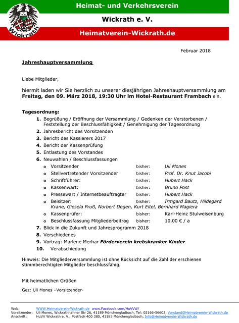 Liebe Mitglieder, hiermit möchten wir Sie zu unserer diesjährigen Jahreshauptversammlung, am Freitag, den 09. März 2018, 19:30 Uhr im Hotel-Restaurant Frambach einladen