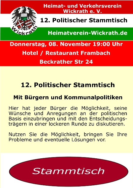 | Dienstag, 30. Oktober 19:00 Uhr treffen sich die Vereinsvorstände aller Wickrather Vereine im Wickrather Altenheim zu ihrer AGENDA | |