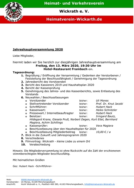 Hier können Sie sich unseren vorläufigen Jahresplan ausdrucken! Hier können Sie sich den Wickrath-Kalender ausdrucken! Wir freuen uns auf ein Wiedersehen bei unseren Veranstaltungen und verbleiben mit heimatverbundenen Grüßen Hubert Hack für den Vorstand