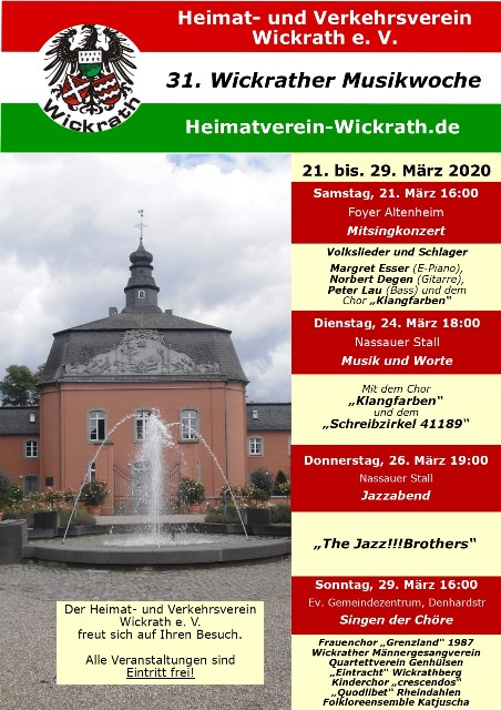 31. Wickrather Musikwoche vom 21. bis 29. März 2020 Die Wickrather Musikwoche steht vor der Tür! In diesem Jahr haben wir für die nun schon im 31. Jahr stattfindende Musikwoche ein abwechslungsreiches Programm in Anlehnung an die erfolgreichen Veranstaltungen des Vorjahres zusammengestellt. Der Besuch der Musikwoche gehört für viele Wickrather schon zur liebgewonnenen Tradition und es wird sich auch sicher in diesem Jahr wieder sehr lohnen, die angebotenen Konzerte zu besuchen. ........................................................................... Samstag, 21. März 16:00 Uhr / Foyer Altenheim Sankt Antonius - Mitsingkonzert- Auch schon fast Tradition ist in der Musikwoche unser Mitsingkonzert für alle. Mit musikalischer Begleitung von Margret Esser (Klavier) und Peter Lau (Bass) Norbert Degen (Gitarre) werden Volks-, Wanderlieder und Schlager aus vergangenen Jahrhunderten und neuer Zeit gemeinsam gesungen. Stimmgewaltige Unterstützung ist gegeben durch den Chor „Klangfarben“ unter der Leitung von Margret Esser. Der Chor wird auch einige Lieder alleine vortragen. Jeder, dem Singen Freude macht, ist herzlich eingeladen, Liedtexte werden natürlich dazu verteilt. .............................................................................. Dienstag, 24. März 18:00 Uhr / Nassauer Stall Musik und Worte Nach dem Erfolg im letzten Jahr wird diese schöne Idee erneut an diesem Abend aufgegriffen. In einer gemeinsamen Veranstaltung vom Chor „Klangfarben“ unter der Leitung von Margret Esser und dem „Schreibzirkel 41189“ werden abwechselnd vom Chor Lieder gesungen und dazu Texte und Gedichte vom Schreibzirkel vorgetragen. Der Chor „Klangfarben“ wurde 2017 von Margret Esser gegründet und widmet sich bevorzugt dem klassischen, mehrstimmigen Liedgut und Volksliedern. Der „Schreibzirkel 41189“ ist eine Gruppe von Hobbyautoren, die sich in unregelmäßigen Abständen in Wickrath trifft. Kleine Gedichte in diversen Formen und kurze Geschichten werden dann vorgestellt und besprochen. Die Arbeiten – meist mit einer großen Portion Humor gewürzt - handeln oft von Erinnerungen und persönlichen Beobachtungen der Autoren im Alltag. Sicher eine interessante Veranstaltung! ............................................................................ Donnerstag, 26. März 19:00 Uhr / Nassauer Stall Jazz Der Donnerstag steht im Zeichen des Jazz. Die fünfköpfige Band „THE JAZZ!!!BROTHERS“ hat der Pflege des traditionellen, melodiös ausgerichteten Jazz verschrieben. Klassische Musiktitel aus den Bereichen Dixieland, Chicago-Jazz, Swing und Blues werden mit eigenen Arrangements dargeboten. Durch diese Vielfalt ergibt sich ein spannungsreiches Repertoire, angereichert mit unterschiedlicher Instrumentierung und Gesangseinlagen. Diese Mischung – dargeboten von einer sehr spielfreudigen Band - wird von den Zuhörern als abwechslungsreich und mitreißend empfunden, so die Reaktionen beim Konzert in der stimmungsvollen Atmosphäre des Nassauer Stalles im letzten Jahr. Die Zuhörer waren begeistert! Zur Band gehören: Dieter Reich (Klarinette, Sopran-, Alt- und Tenorsaxofon) Christoph Schmidt (Banjo, Gesang) Hans-Walter Schmidt (Kornett, Flügelhorn) Peter Lau (Bass) Henrik Lau (Schlagzeug) ............................................................................ Sonntag, 29. März 16:00 Uhr / Gemeindezentrum Denhardstraße Singen der Chöre Zum Abschluss der Musikwoche 2020 wird wieder das traditionelle Singen der Wickrather Chöre stattfinden, diesmal bereichert um den Chor „Quodlibet“ aus Rheindahlen und dem "Quartettverein Genhülsen". Die Chöre werden Ausschnitte aus ihrem aktuellen Programm präsentieren und es ist auch wieder ein Kinderchor dabei.