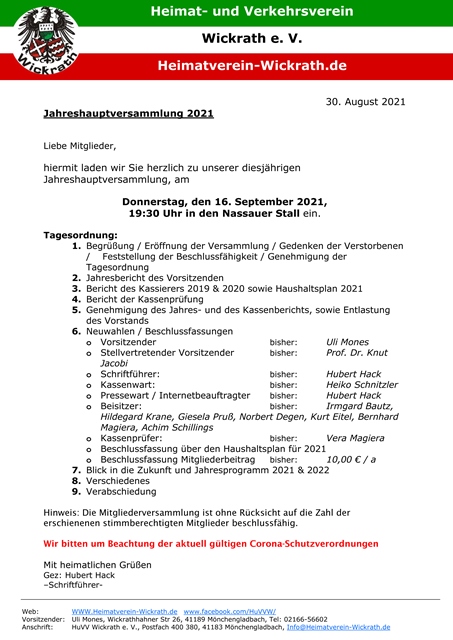 Sollte Ihnen dieser Newsletter nicht korrekt angezeigt werden, klicken Sie bitte hier! Liebe Mitglieder, hiermit möchten wir Sie zu unserer diesjährigen Jahreshauptversammlung, am Donnerstag, den 16. September 2021, 19:30 Uhr in den Nassauer Stall einladen.