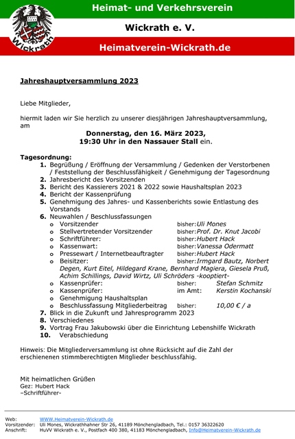 Sollte Ihnen dieser Newsletter nicht korrekt angezeigt werden, klicken Sie bitte hier! Liebe Mitglieder, hiermit möchten wir Sie zu unserer diesjährigen Jahreshauptversammlung, am Donnerstag, den 16. März 2023, 19:30 Uhr in den Nassauer Stall einladen.