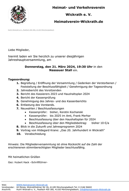 Sollte Ihnen dieser Newsletter nicht korrekt angezeigt werden, klicken Sie bitte hier! Liebe Mitglieder, hiermit möchten wir Sie zu unserer diesjährigen Jahreshauptversammlung, am Donnerstag, den 21. März 2024, 19:30 Uhr in den Nassauer Stall einladen.