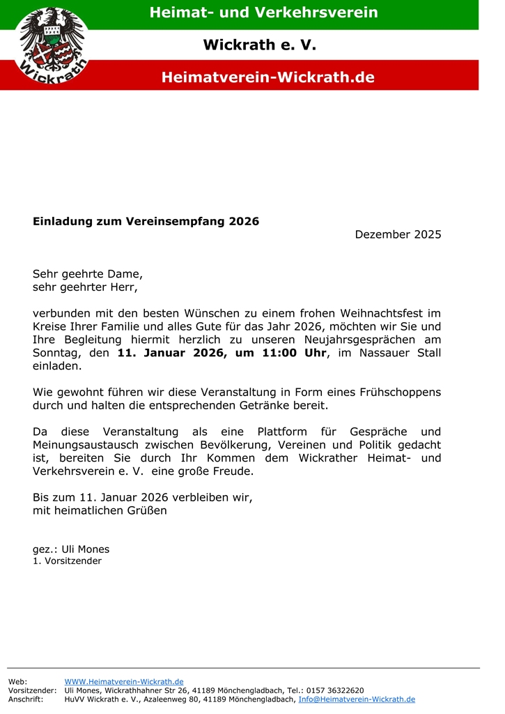 Liebe Mitglieder, sehr geehrte Damen und Herren, zum Jahresende möchten wir uns bei Ihnen für Ihre Treue und Verbundenheit zum Heimat- und Verkehrsverein Wickrath e. V. bedanken, eine geruhsame Advents- und Wihnachtszeit, viel Glück und Gesundheit in 2026 wünschen. In diesem Sinne möchten wir Sie nochmals herzlichst zu unserer letzten Veranstaltung in diesem Jahr und zur ersten Veranstaltung im neuen Jahr einladen. Hier zum HuVV-Kalender 2026 Hier zum Wickrather Veranstaltungskalender 2026 |